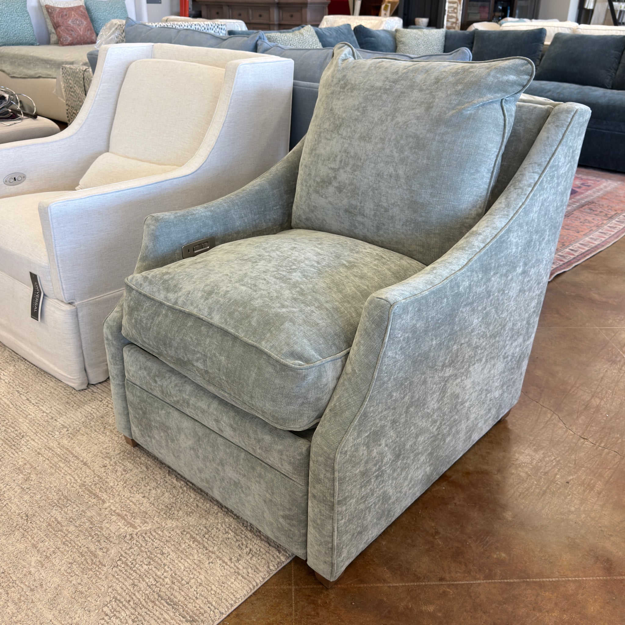 Kare Zero Wall Power Recliner by Robin Bruce Furniture. Featured in 100% Polyester sage green fabric. The Kara Power Recliner requires zero wall clearance, and comes with a powered recliner mechanism. Also available to order in 180° Swivel option.