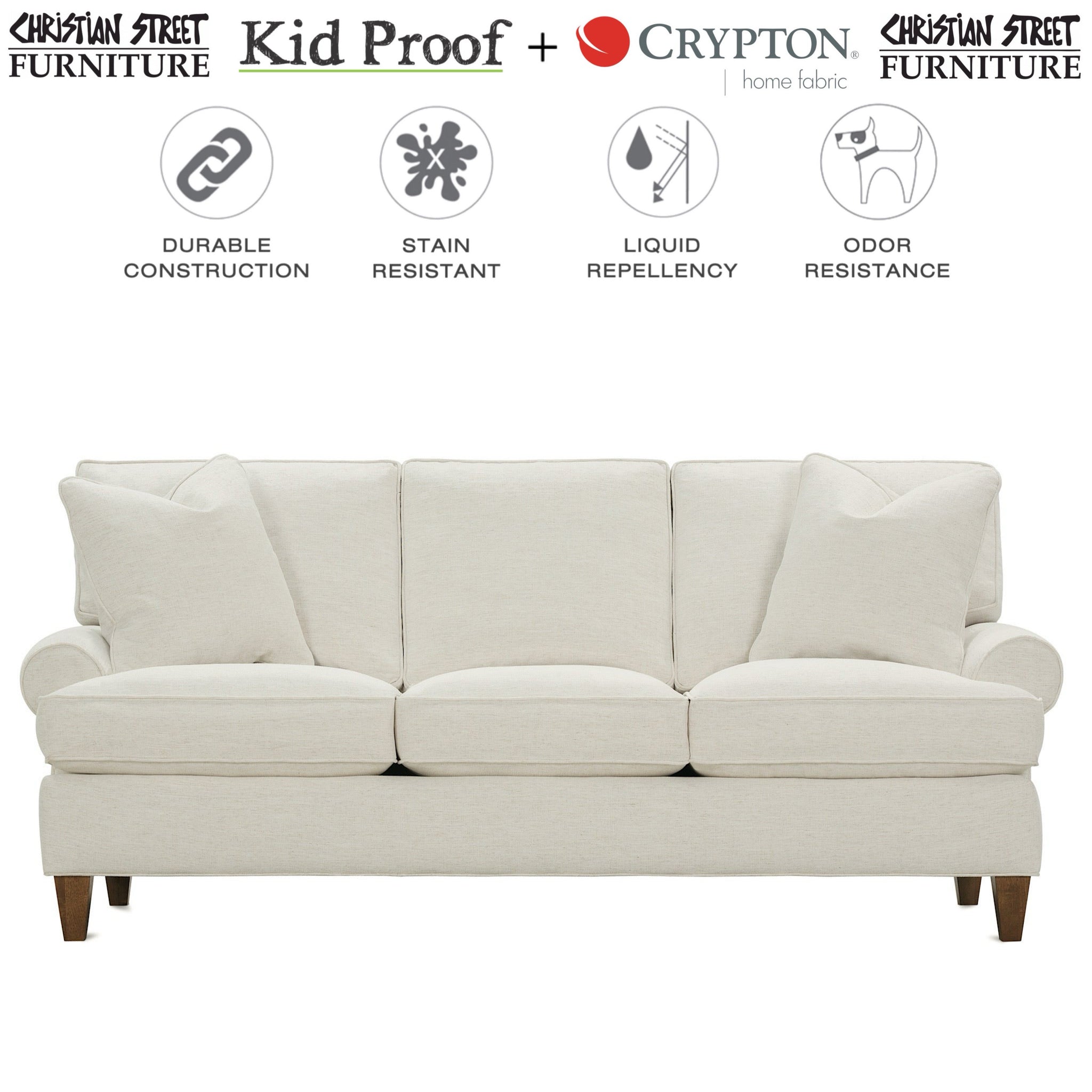 Robin Bruce Cindy 84” Sofa in Kid Proof Crypton fabric. Features down wrapped cushions. L84” x D39” x H40” Seat Height 20” Seat Depth 22” Arm Height 24”Width Between Arms 68”